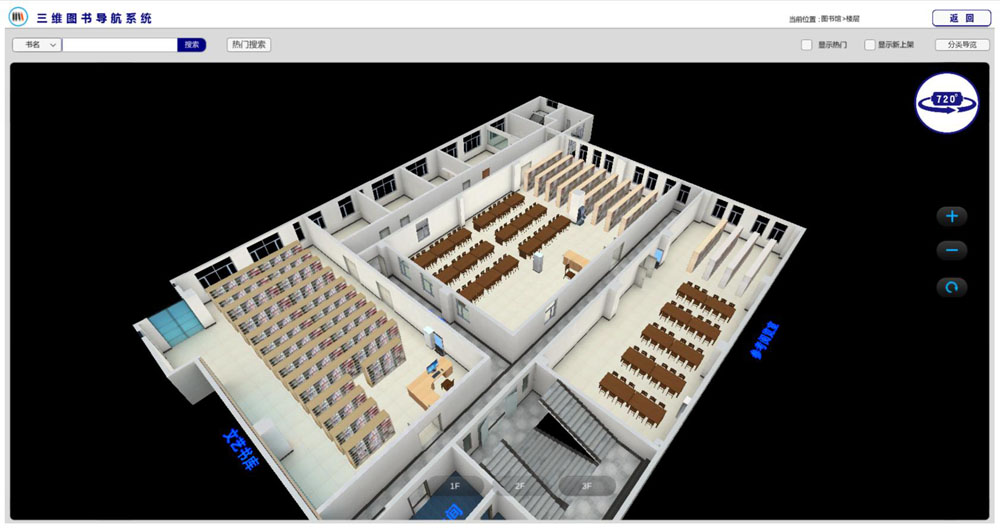 將線下圖書(shū)館現(xiàn)有的資源(包括館內(nèi)圖書(shū)、設(shè)備、空間布局、裝修風(fēng)格、家具等)進(jìn)行線上虛擬可視化展示,仿真讀者在線下瀏覽圖書(shū)時(shí)的真實(shí)場(chǎng)景。