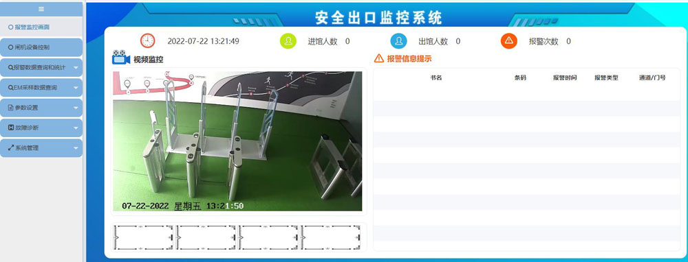 04 跟出口門禁和大屏進(jìn)行聯(lián)動(dòng):智能檢測(cè)終端與出口門禁聯(lián)動(dòng),當(dāng)報(bào)警時(shí),出口門禁自動(dòng)關(guān)閉,讀者無法通過,同時(shí)視頻監(jiān)控啟動(dòng)拍照功能,記錄報(bào)警畫面,數(shù)據(jù)大屏顯示監(jiān)控視頻和報(bào)警圖書信息。